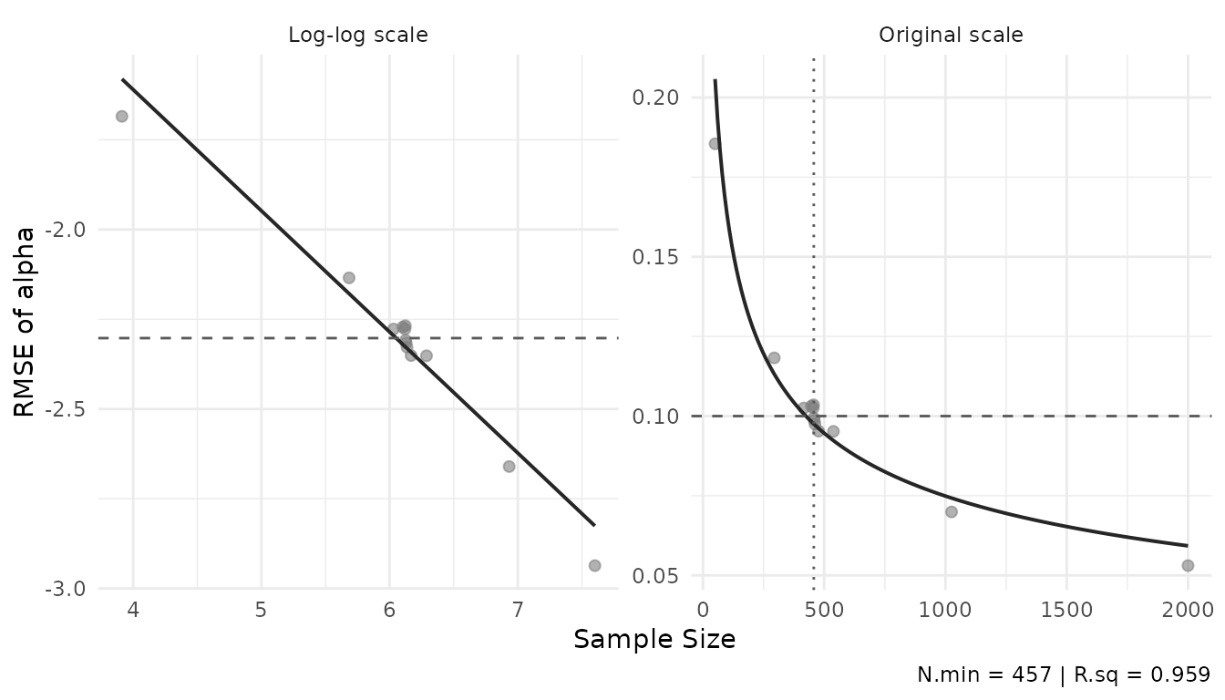 The power curve shows how RMSE decreases with sample size, fitted as